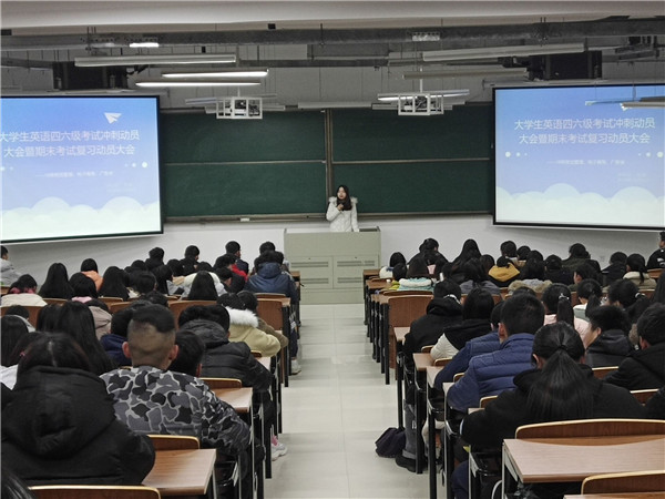 大会分为大学生英语四六级考试冲刺动员与期末考试动员两部分。会上,朱颖老师首先强调了英语四六级考试的重要性,并要求全体同学把英语四六级考试作为现阶段的主要任务,尽全力冲刺四六级。她向全体同学提出几点英语学习的重点和技巧,号召鼓励全体同学坚持学习、努力拼搏,利用考前一周的时间突击作文、听力和阅读理解的训练,利用好早读时间巩固单词背诵,争取全体同学在大一阶段通过英语四级考试。