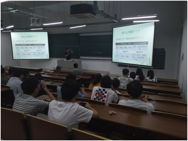会上,毕强老师首先从为什么考研、考研的意义及国家相关资助政策等方面进行了宣讲,为同学们分析了考研的形势与动态,提醒大家不要错过一生当中考研的最好机会,鼓励同学们选择考研,为将来更好的就业打下基础。随后,12级考研录取至南京邮电大学现就读博二的学生代表任恒毅从参考书的选择、复习时间的安排、复习方法、应试技巧等方面给大家分享了他们的心得体会。最后,拟考研学生邓菲代表四个专业意向考研学生表达了立志考研的决心与态度,将不骄不躁、永不言弃,克服困难,专心备考.