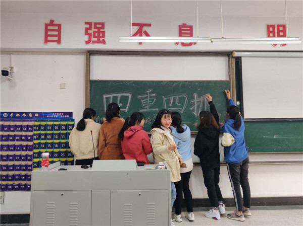 会议上主持人讲述了“四重四抓”的具体内容及含义,普及了传销的种类和一些传销行骗的步骤,并从典型案例入手,给同学们敲响安全意识的警钟,让同学们认识到了传销的危害性。辅导员要求同学们重学校纪校规、重温安全纪律、重读安全事项、重签安全提醒,要求各班委抓思想认识、抓组织管理、抓检视问题、抓整改落实,各班学生代表在辅导员老师的组织下走向讲台,在写有“四重四抓”的黑板上写下自己的名字。