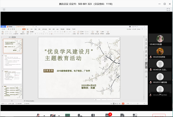 4月8日下午,2018级物流管理、电子商务、广告学专业通过网络平台开展了“优良学风建设月”主题教育活动动员班会。本次班会由辅导员朱颖老师主持,三个专业全体同学参加。