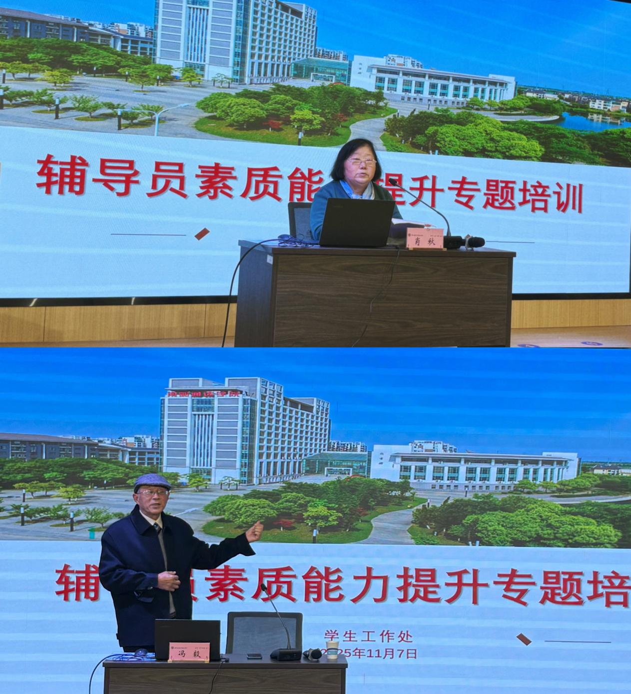11月7日上午,南京邮电大学冯毅、肖秋老师来我院作“薪火相传育新人经验分享促提升”辅导员能力提升专题培训。学院党委副书记兼副院长刘伟,学生工作处、各二级学院党总支负责人及全体辅导员现场聆听讲座,活动由学生工作处副处长岑慧主持。